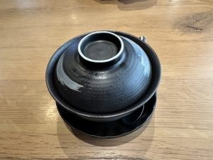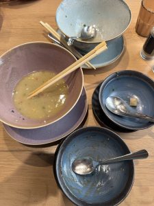 手前が、私の席になるのですが、お茶碗が二つとも私の席寄りに置いてある事に、ケラケラ