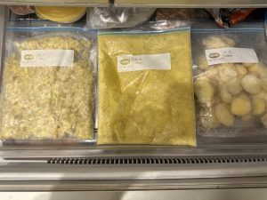 スライス、刻み、すりおろしと3タイプにして密閉袋に平らにして入れて、冷凍庫へ。